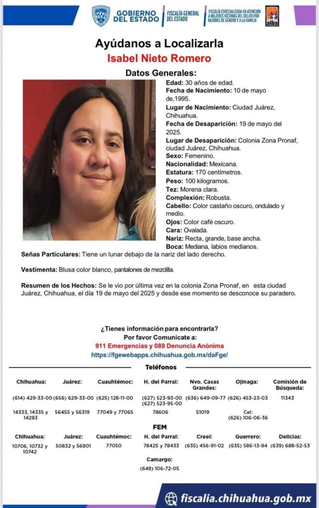 La Unidad Especializada en Investigación de Personas no Localizadas y/o Desaparecidas, de la Fiscalía Especializada en Atención a Mujeres Víctimas del Delito por Razones de Género y a la Familia en Ciudad Juárez, lleva a cabo las indagatorias pertinentes para esclarecer los hechos en los que una mujer con reporte de ausencia, fue localizada sin vida ayer domingo, se informó a través de un comunicado de prensa.