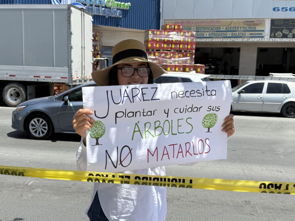 Ciudad Juárez.- Integrantes de la organización civil Árboles en Resistencia realizaron una protesta en el camellón central de la avenida Ejército Nacional y Plutarco Elías Calles, luego de que la empresa constructora Movícom, deforestó seis árboles en el lugar.