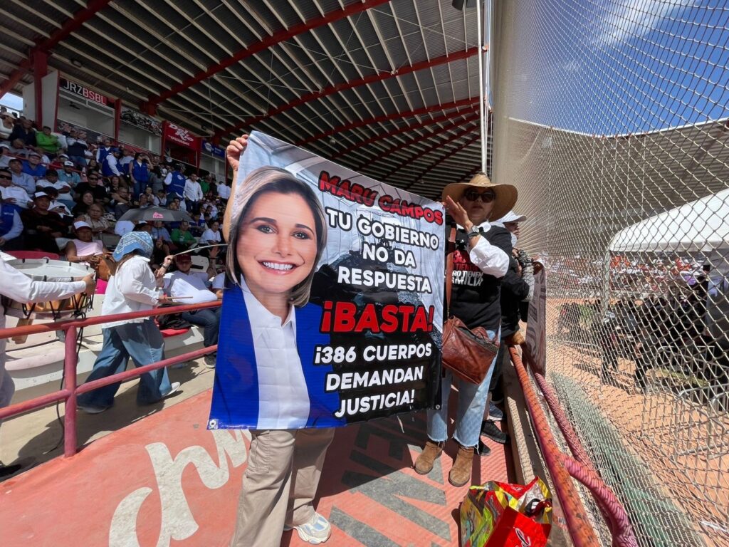 “Maru Campos, tu gobierno no da respuesta. ¡Basta! 386 cuerpos demandan justicia”, decía una de las lonas de gran tamaño, con la fotografía de la gobernadora de Chihuahua.