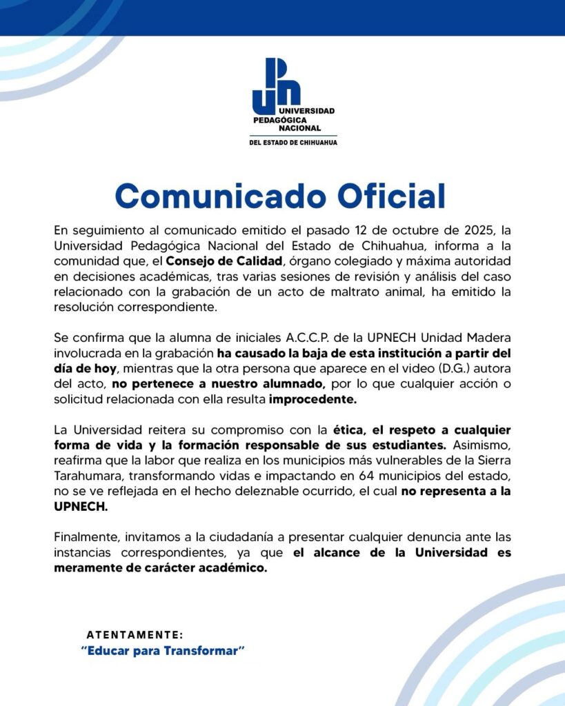 Este lunes la UPN informó que el Consejo de Calidad, órgano colegiado y máxima autoridad en decisiones académicas, tras varias sesiones de revisión y análisis del caso relacionado con la grabación de dicho acto de maltrato animal, ha emitido la resolución en la que la alumna de iniciales A.C.C.P. de la UPNECH Unidad Madera involucrada en la grabación, ha causado la baja de la institución a partir del día de hoy.