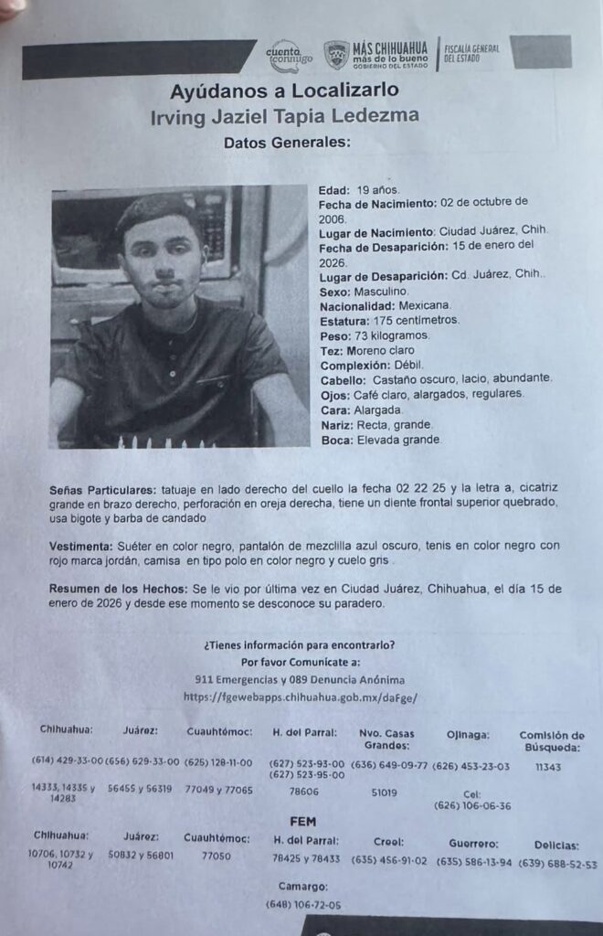 Ciudad Juárez.- El cuerpo localizado el lunes en un kínder abandonado, ubicado en el Infonavit Solidaridad, era de Irving Jaziel Tapia Ledezma, de 19 años de edad, quien contaba con reporte de desaparición desde el pasado 15 de enero, confirmaron sus familiares.